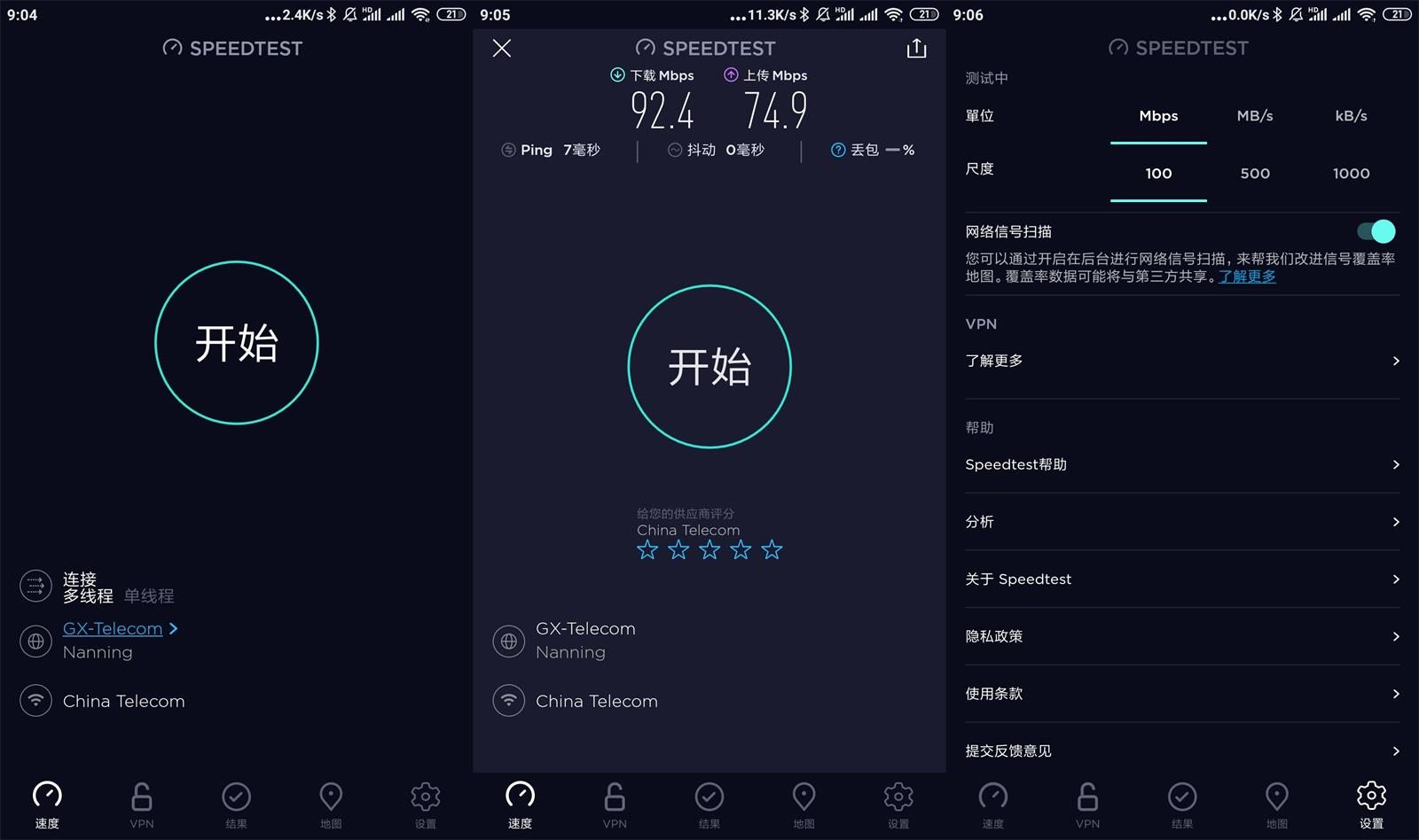 Speedtest v6.4.5 安卓高级版满足需求!全球排名第一的网速测试工具,支持 5G/4G 网络测试,实时显示 Ping 值、下载 / 上传速度,新增视频质量测试功能,可检测网速支持的最高视频比特率。