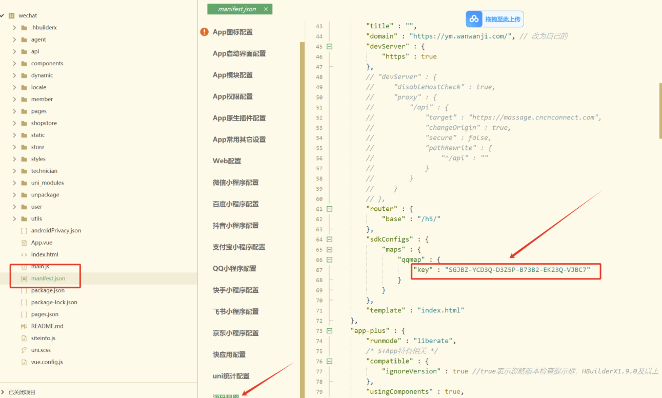 3、基础配置分配Appid、源码视图设置腾讯地图key和公众号id