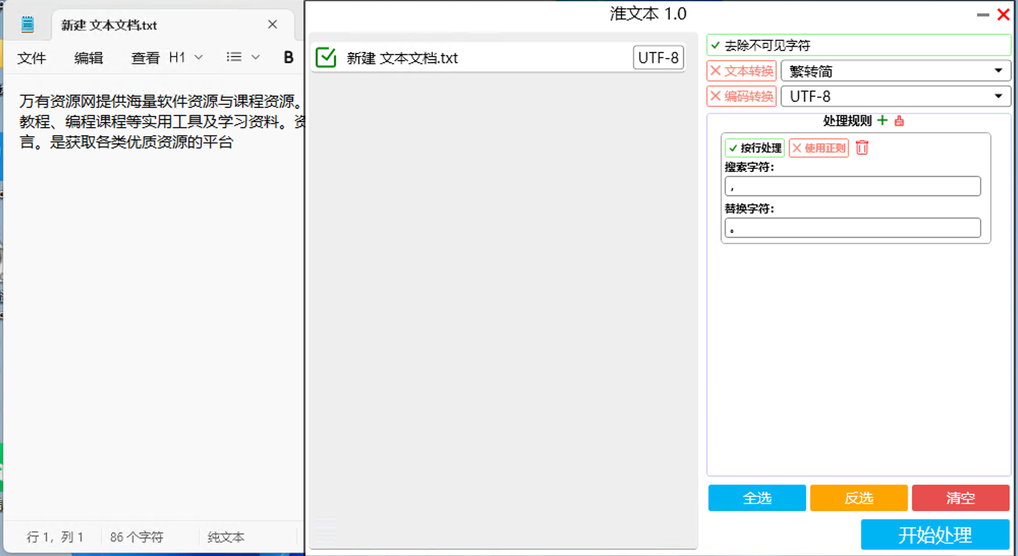 Windows 批量处理文本 v1.0 支持去除不可见字符、文本编码转换(UTF-8 等)、繁体转简体、正则替换字符、行过滤删除等核心功能。无需密码,拖入文件即可批量处理,按设置条件顺序执行,处理后自动更新文件(建议提前备份)。适配日常文本整理、数据清洗、格式统一等场景,大幅提升文本处理效率,是实用的 Windows 小工具!