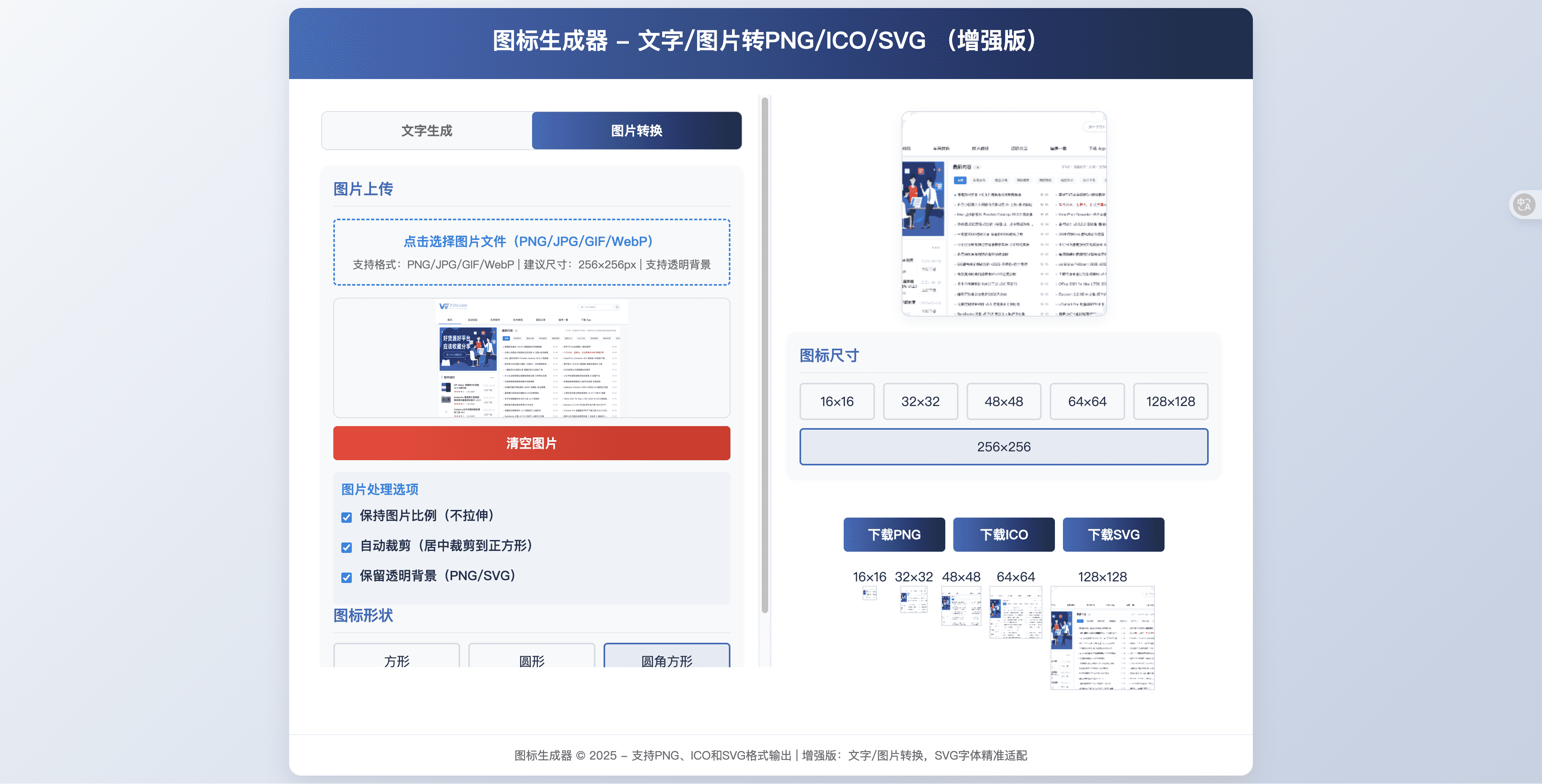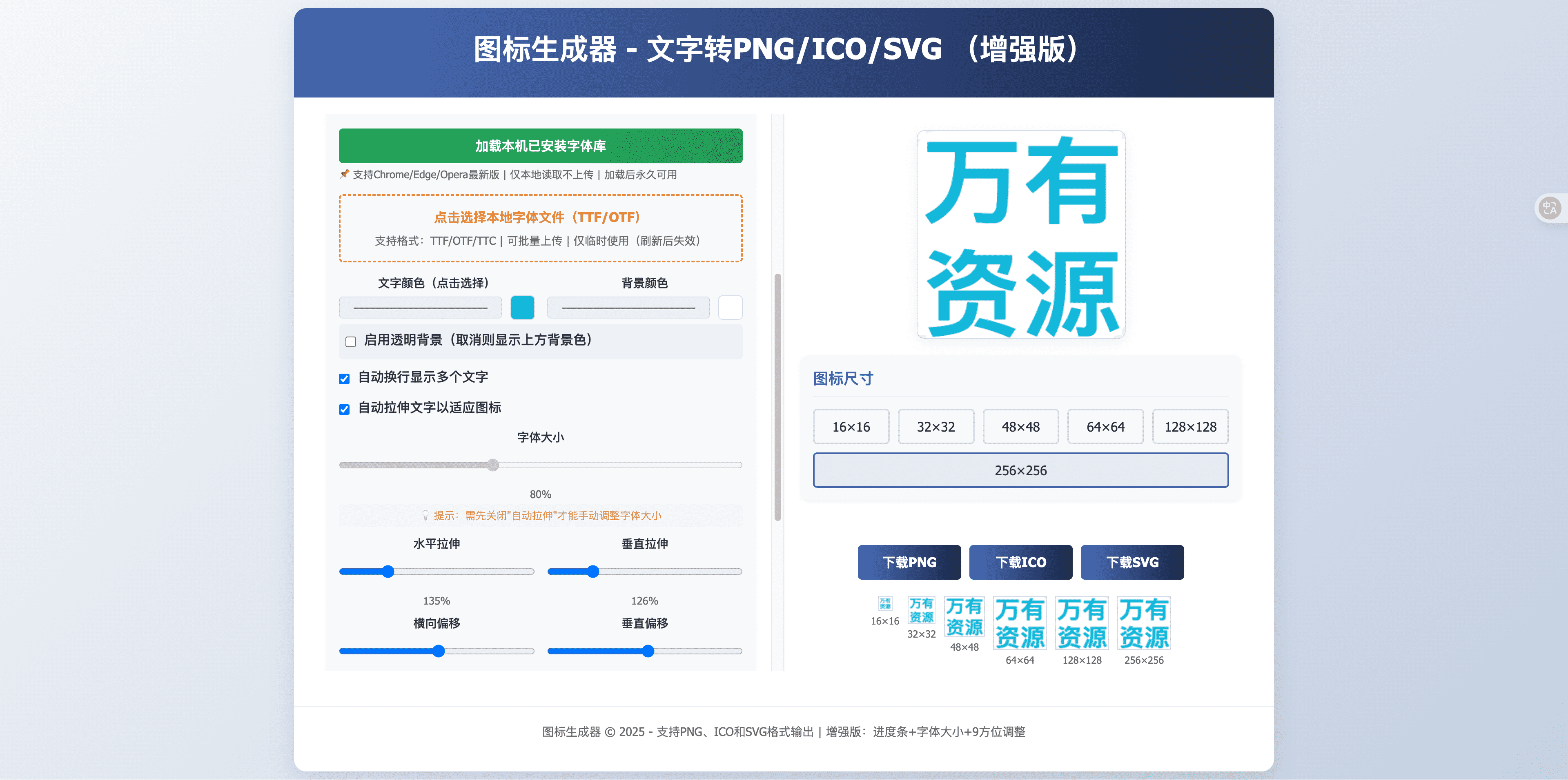 绿色免安装的本地图标生成工具(增强版),支持将任意文字或本地图片一键转换为 PNG、ICO、SVG 等主流图标格式。自动拉伸适配多种标准尺寸(如 16×16、32×32、64×64、256×256),保留透明通道,操作简单直观。无需联网,全程本地处理,非常适合前端开发者制作 favicon.ico、桌面应用图标,或设计师快速输出标准化图标资源。