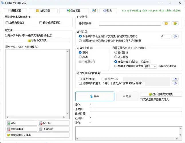 Folder Merger v1.8 汉化版是一款简单高效的 Windows 文件夹合并工具,可将多个源文件夹中的所有文件(含子目录)智能合并到一个目标文件夹。支持“跳过重复文件”、“保留原路径结构”或“扁平化合并”等多种模式,特别适合整理从网盘下载的分卷解压内容、素材包、备份碎片等。软件绿色免安装,界面简洁,操作直观,全程本地运行,无网络请求,保障隐私与效率。