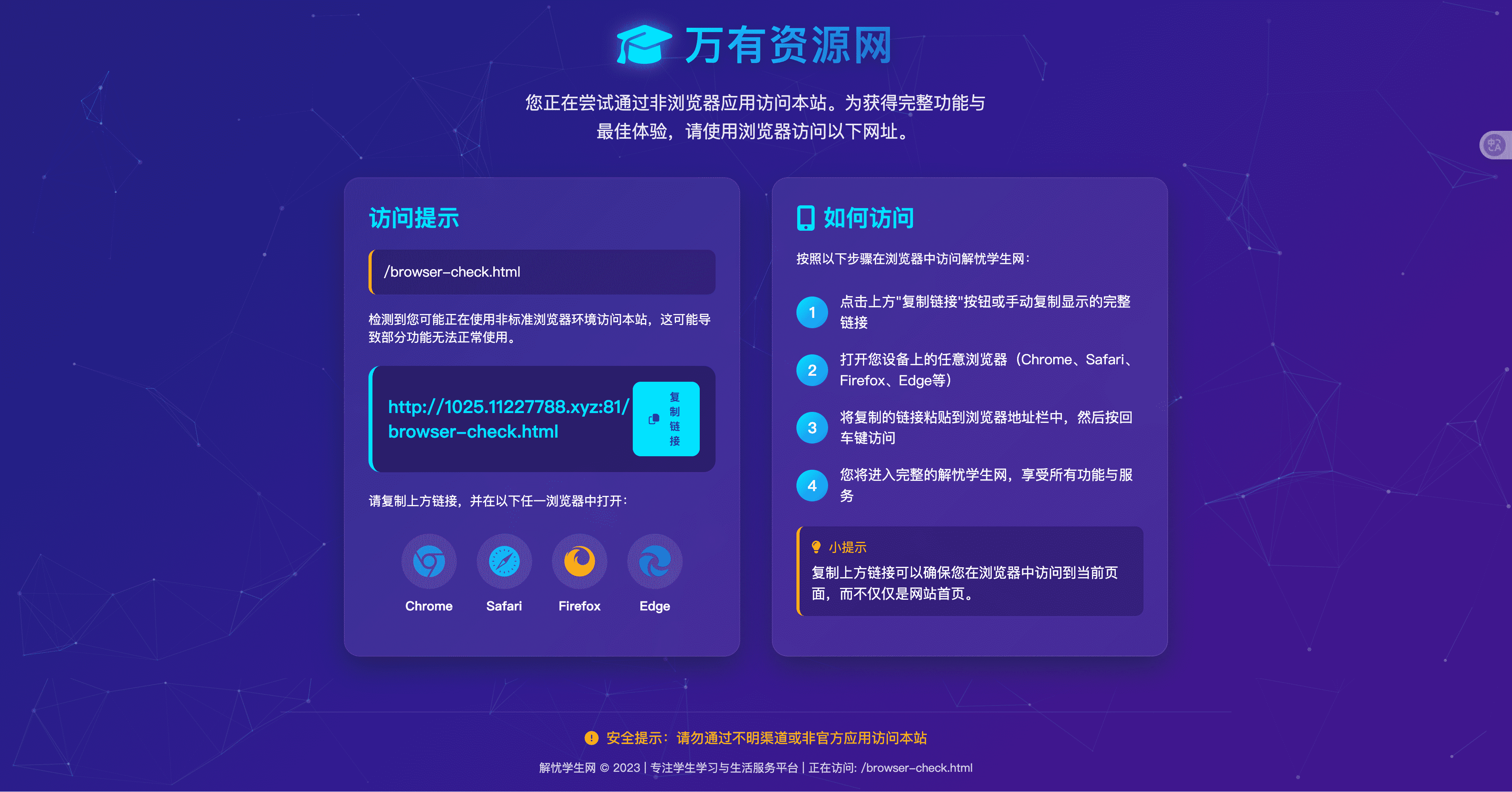 采用动态拦截技术,获取拦截前用户访问的网址,并且传参到拦截页面,可以做到用户通过什么子链接访问网站,只要是微信QQ访问,均会重定向到拦截网页,并显示复制链接到浏览器打开访问,且复制的链接采用动态获取拦截前用户访问的原网址,该拦截代码为解忧学生网亲测原创现在公开给大家学习使用。下面是测试图片。开箱即用。附带教