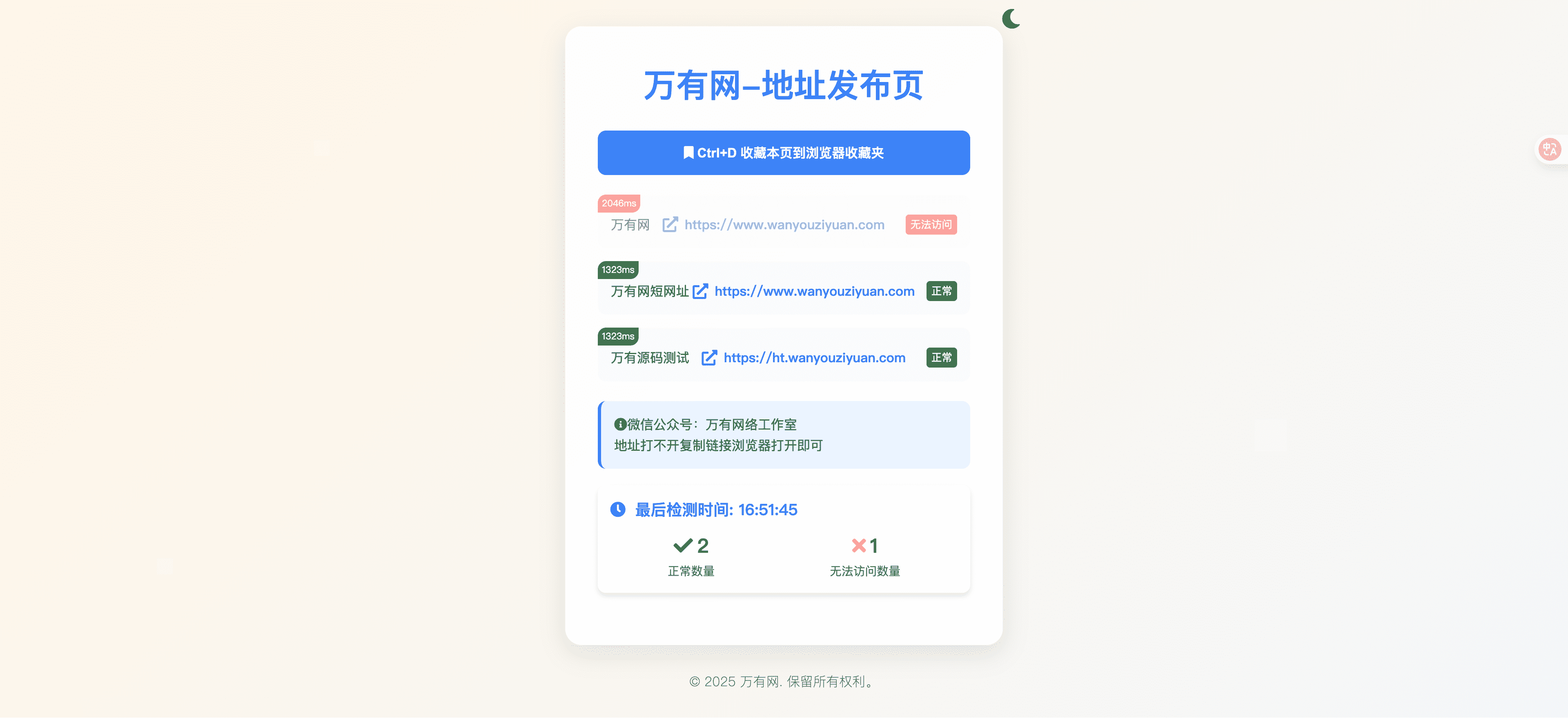 这是一款现代化、轻量级的导航引导页源码,采用纯 HTML/CSS/JS 编写,无需数据库或后端支持,上传至任意网站空间即可运行。支持响应式布局(适配手机与电脑)、深色/浅色主题一键切换,并内置链接有效性自动检测功能(显示绿色/红色状态)。所有内容在 index.html 中直接编辑,适合个人主页、资源聚合站、项目入口或防红跳转页使用。