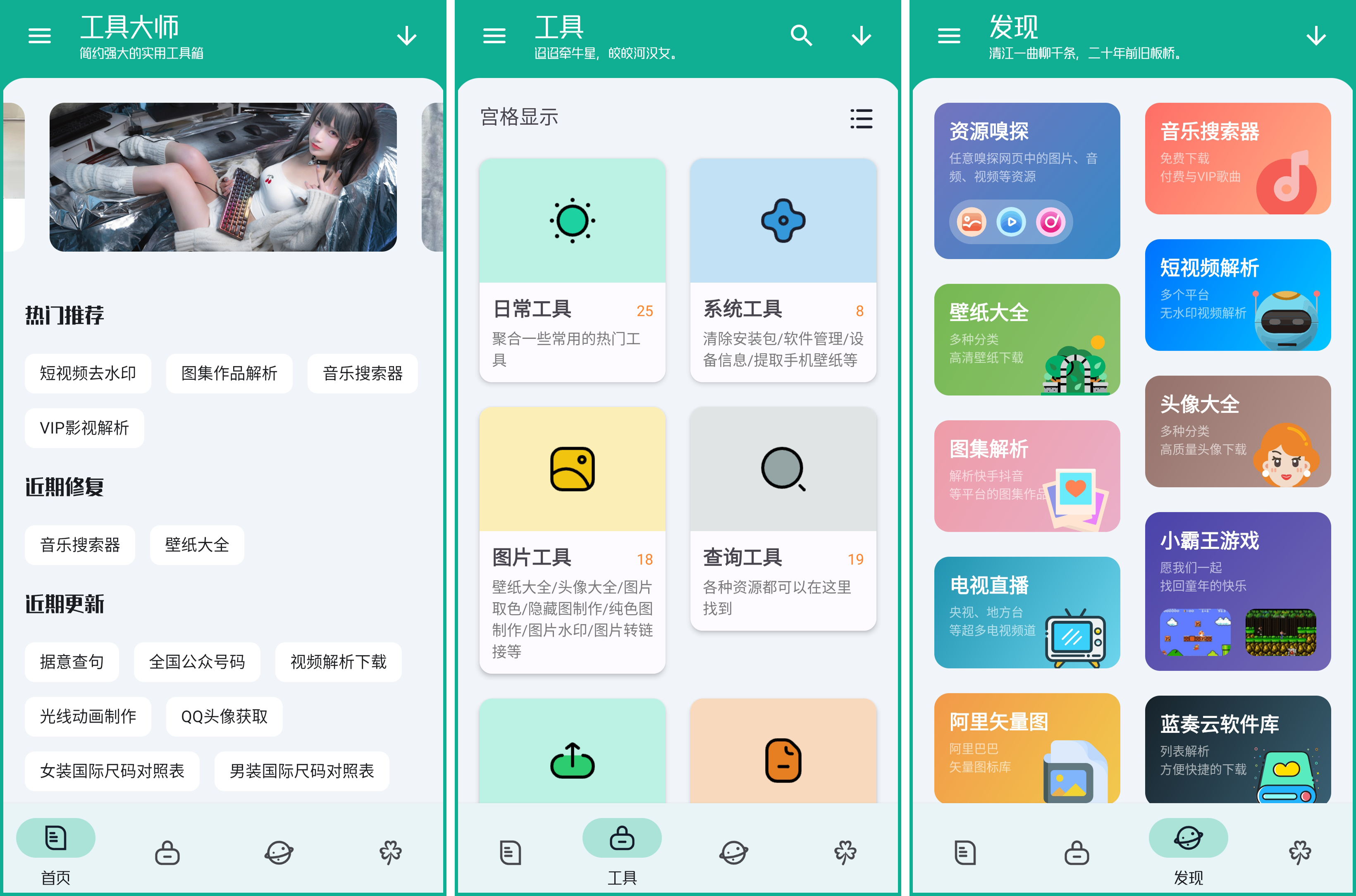工具大师是一款非常实用的手机工具盒软件,为大家聚合了海量的实用小工具,无论是资源嗅探、音乐播放、短视频解析、壁纸大全还是电视直播都是应有尽有,类型相当的丰富多样,而且全部都是免费供大家使用的,能够一站式的为你解决更多的需求,同时软件界面干净清爽,体积小巧,使用起来非常的方便。