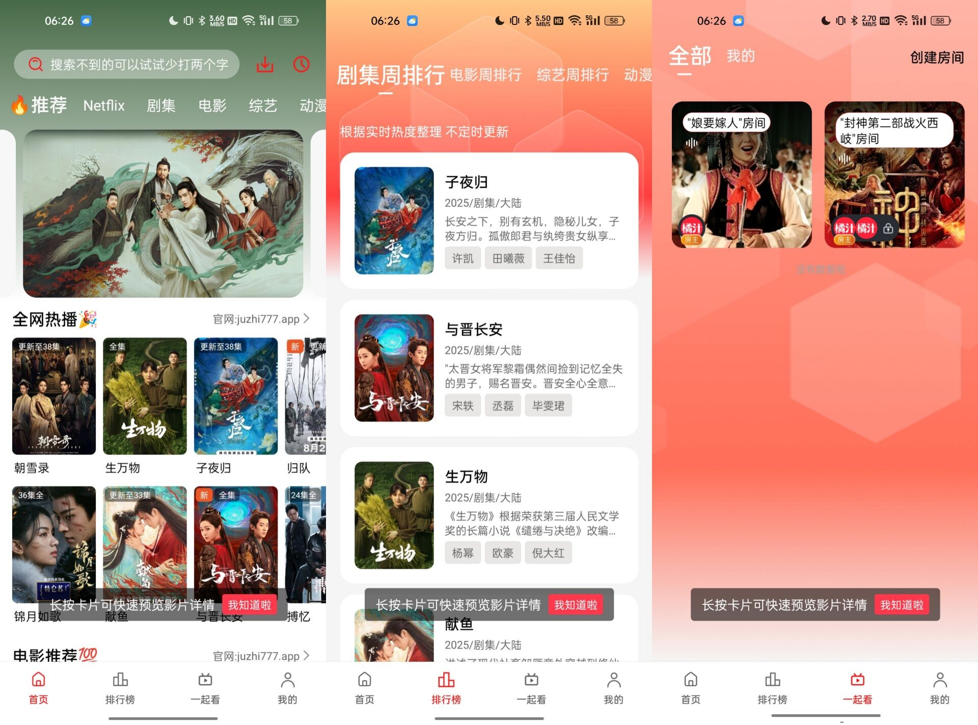 橘汁视频是一款免费安卓影视软件,橘子视频安卓版全网热门影视资源同步更新,排行榜汇集当下热播影视,提供片库和专题筛选,免费观看影视的高清视频,支持下载视频,支持弹幕/倍速播放/TV投屏。