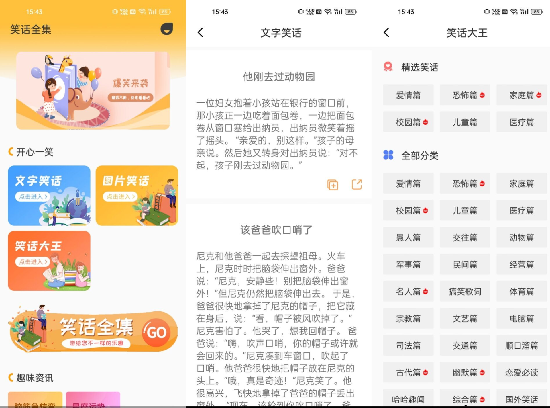 安卓笑话全集一款笑话大全软件,海量笑话合集,笑一笑,每天好心。文字笑话,图笑话,脑筋急转弯等应有尽有,还有超多段子分类选择,实时更新,享受轻松时刻!