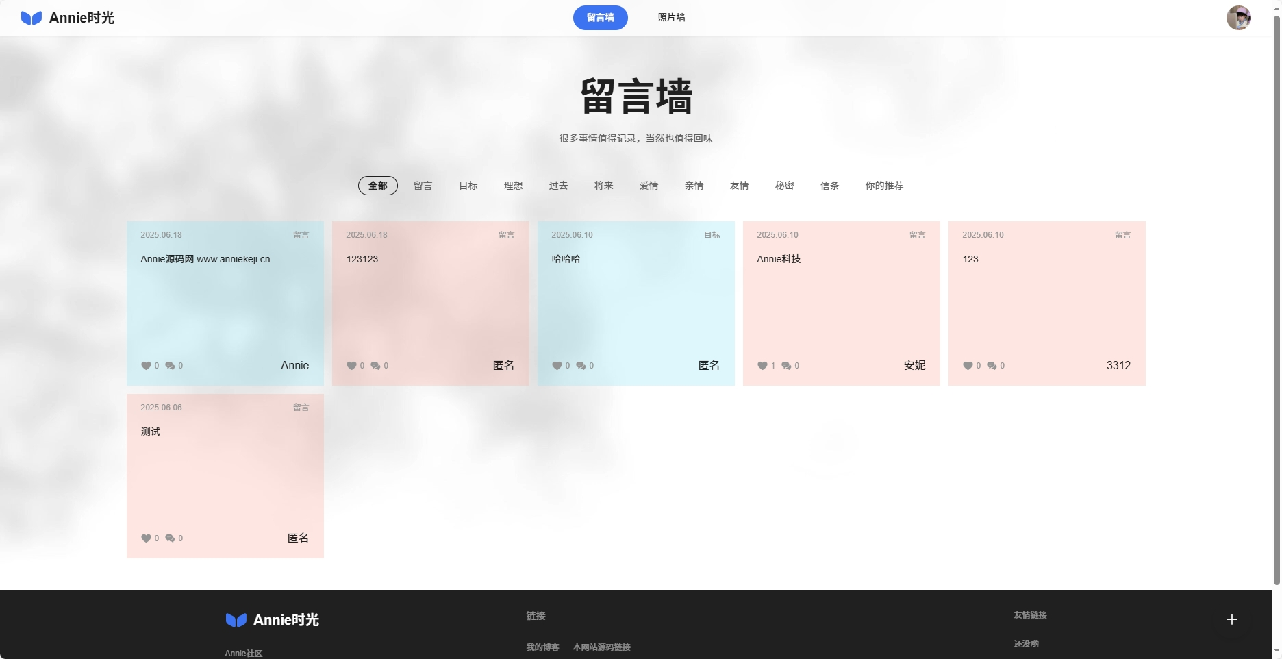 Annie 留言墙是基于 Vue3+Node.js+MySQL 开发的交互式留言项目,支持留言发布、照片墙展示,适配手机、电脑等多设备,界面简洁易用。提供完整下载地址与 B 站视频搭建教程,新手也能跟着教程快速部署;还可作为 Vue 留言板组件二次开发,适合个人搭建专属留言页、网站添加互动留言模块,或开发者学习前后端结合技术