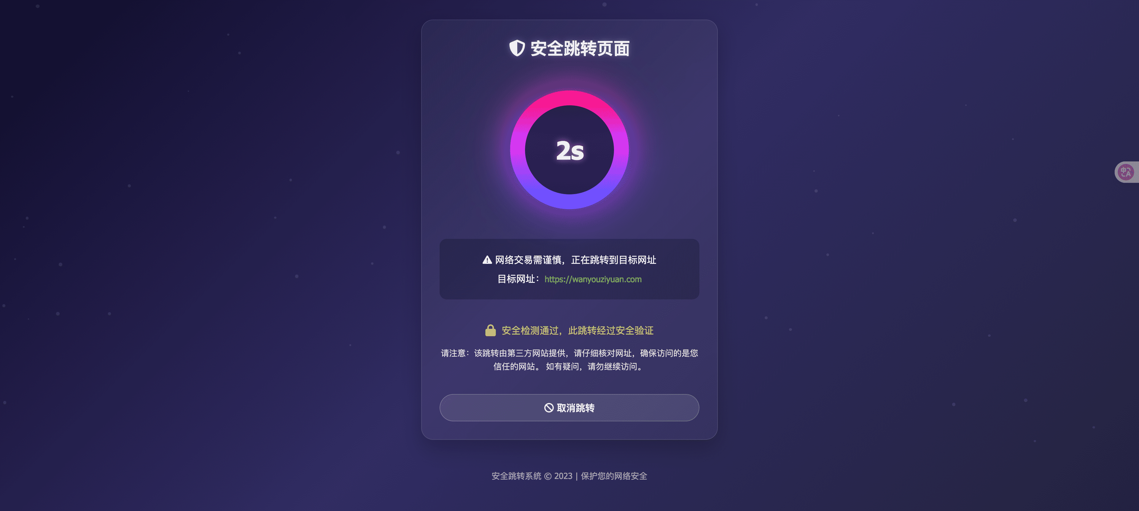 深蓝动态粒子 URL 跳转页面 PHP 源码,是兼具美观与实用性的链接跳转工具!主打深蓝视觉风格,搭配动态粒子特效,UI 精致吸睛,打破传统跳转页的单调感;核心支持网站内链接跳转、广告链接跳转等场景,无需复杂配置
