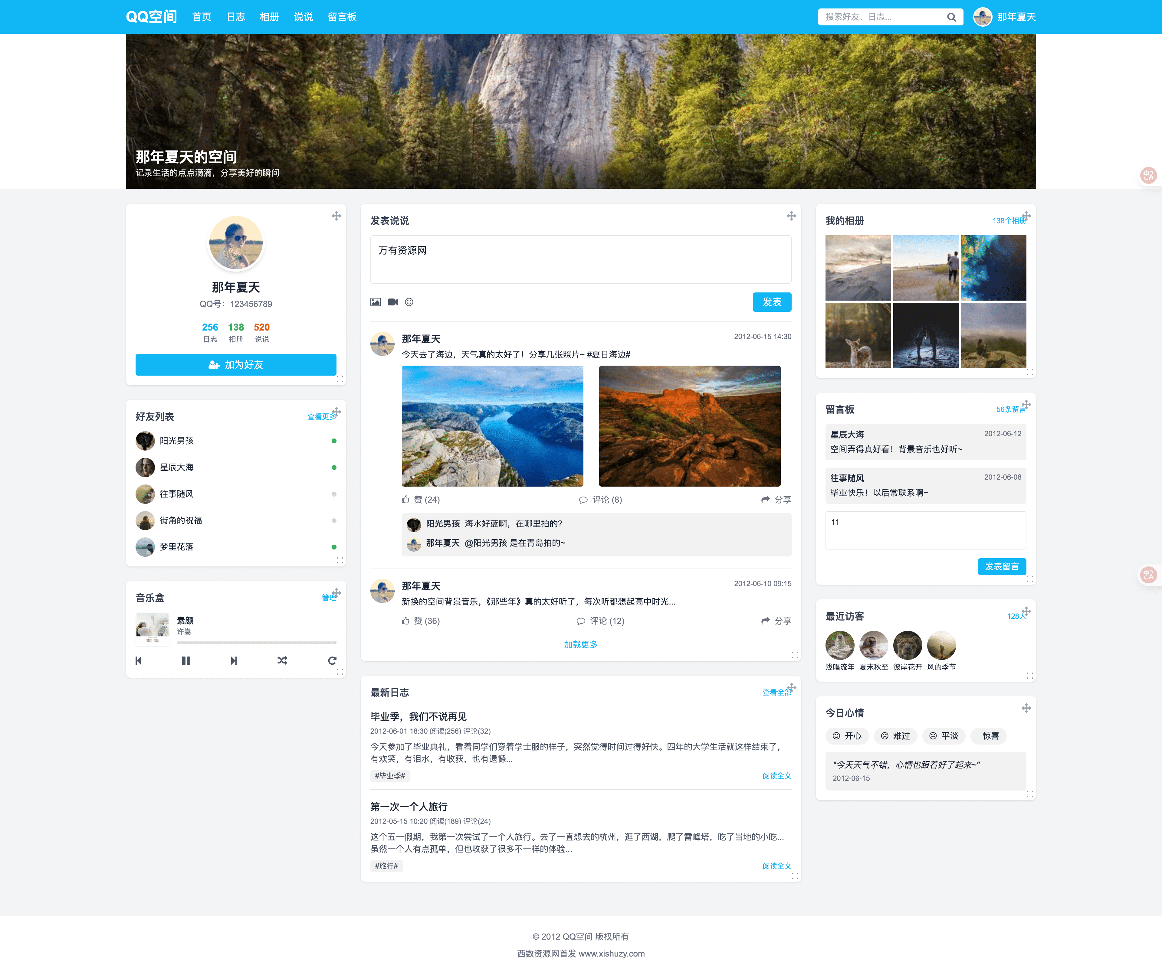 经典布局还原:采用了当年 QQ 空间标志性的三栏布局,顶部有蓝色导航栏和横幅区域,中间是内容区,底部有版权信息。