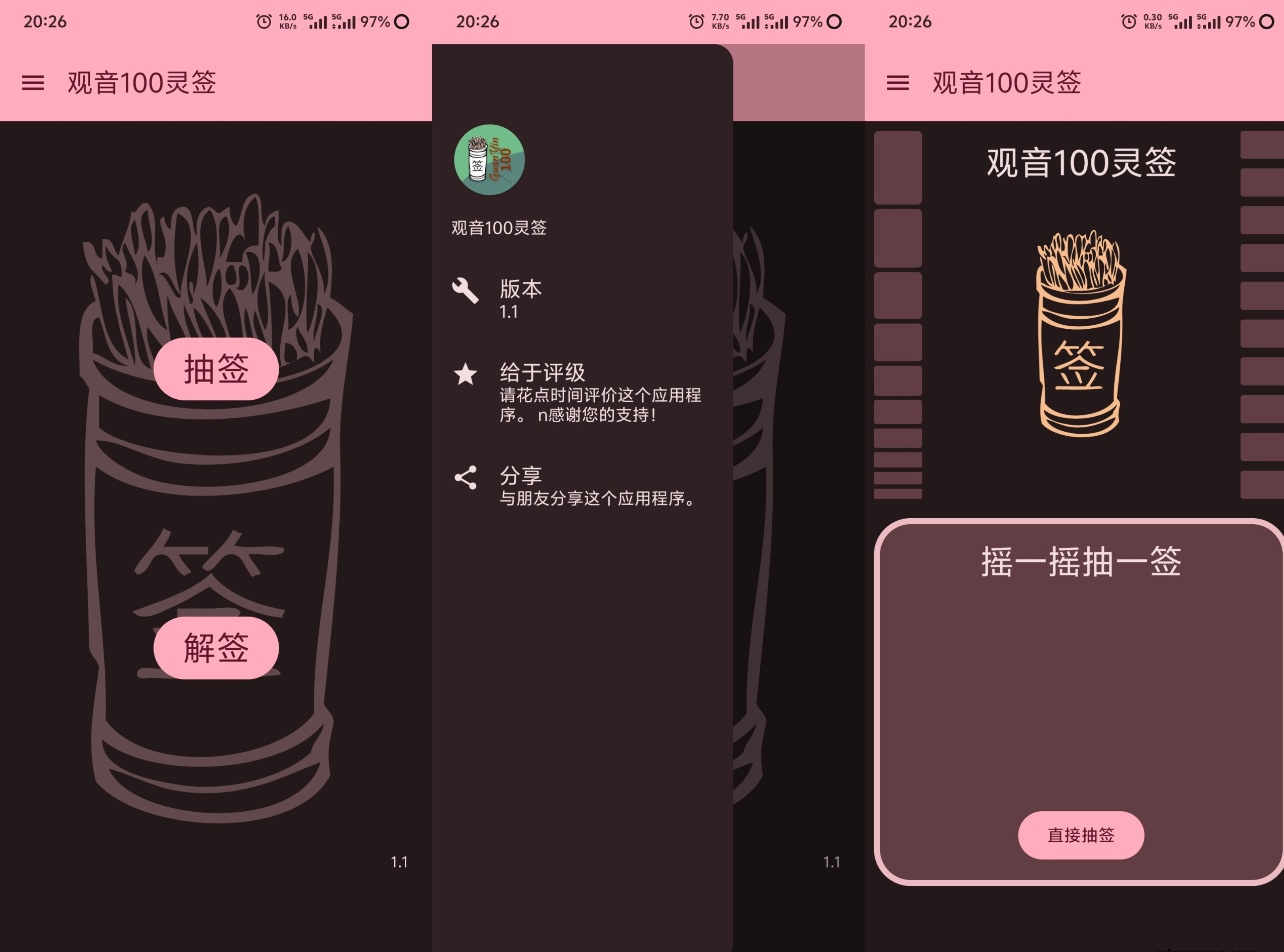 观音 100 灵签 1.1 安卓版是基于传统文化的心灵指引工具!包含 100 支完整观音灵签,提供详细签文解释、签诗解析及配套故事,帮助用户深度理解签意、获得心灵启示。适配安卓系统,操作便捷,支持摇一摇抽签,界面贴合传统文化氛围