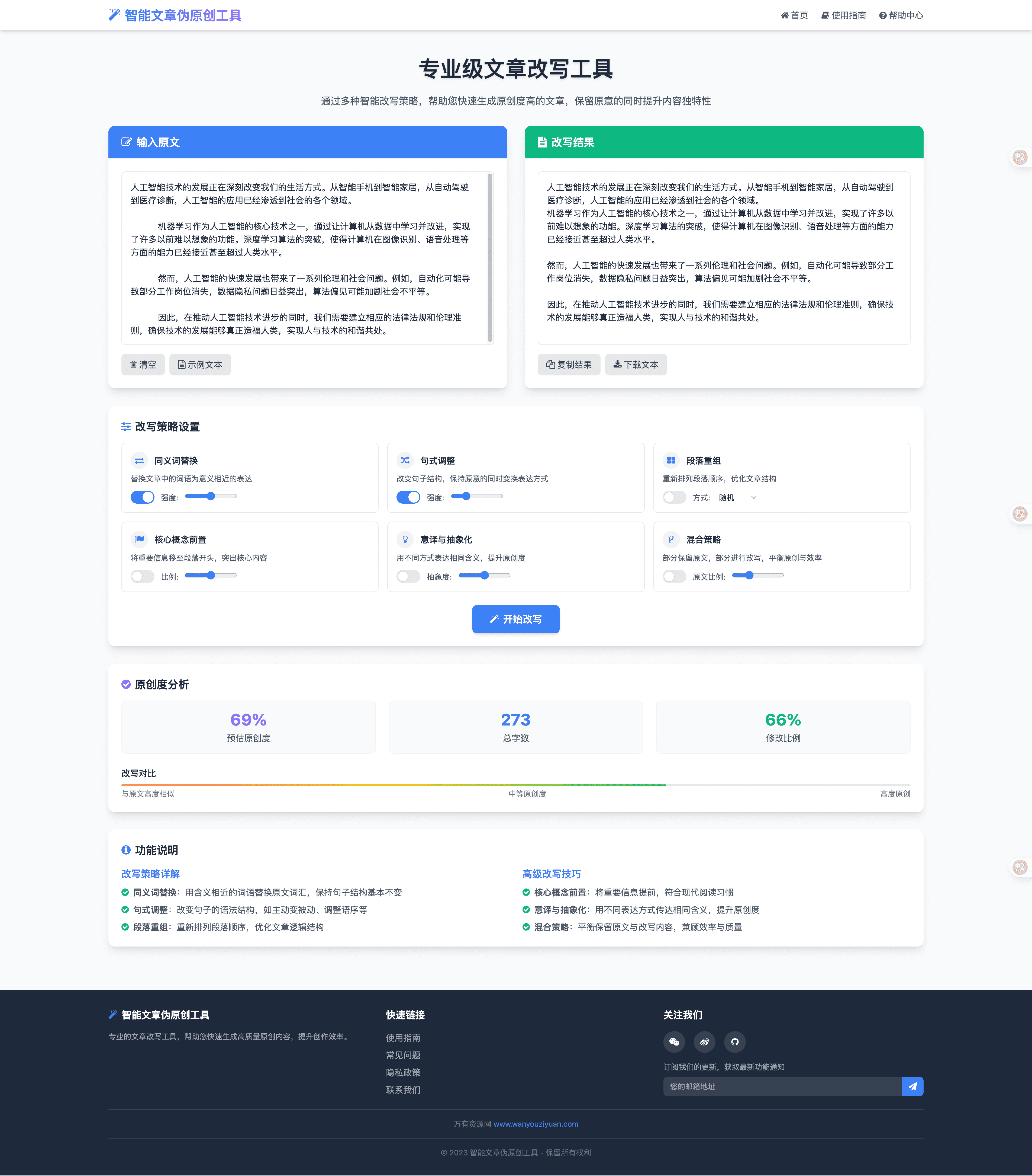 专业级智能文章伪原创工具 HTML 源码,解决普通伪原创相似度高的痛点!支持同义词替换、句式调整、段落重组等 6 大改写策略,可调节参数精准控制效果,自带原创度分析(显示预估原创度、修改比例)。可视化界面 + 响应式设计,适配手机 / 电脑,含示例文本、结果下载等便捷功能,部署简单,适合自媒体人、内容创作者批量生成独特文章,也可作为前端开发者学习的优质静态源码!