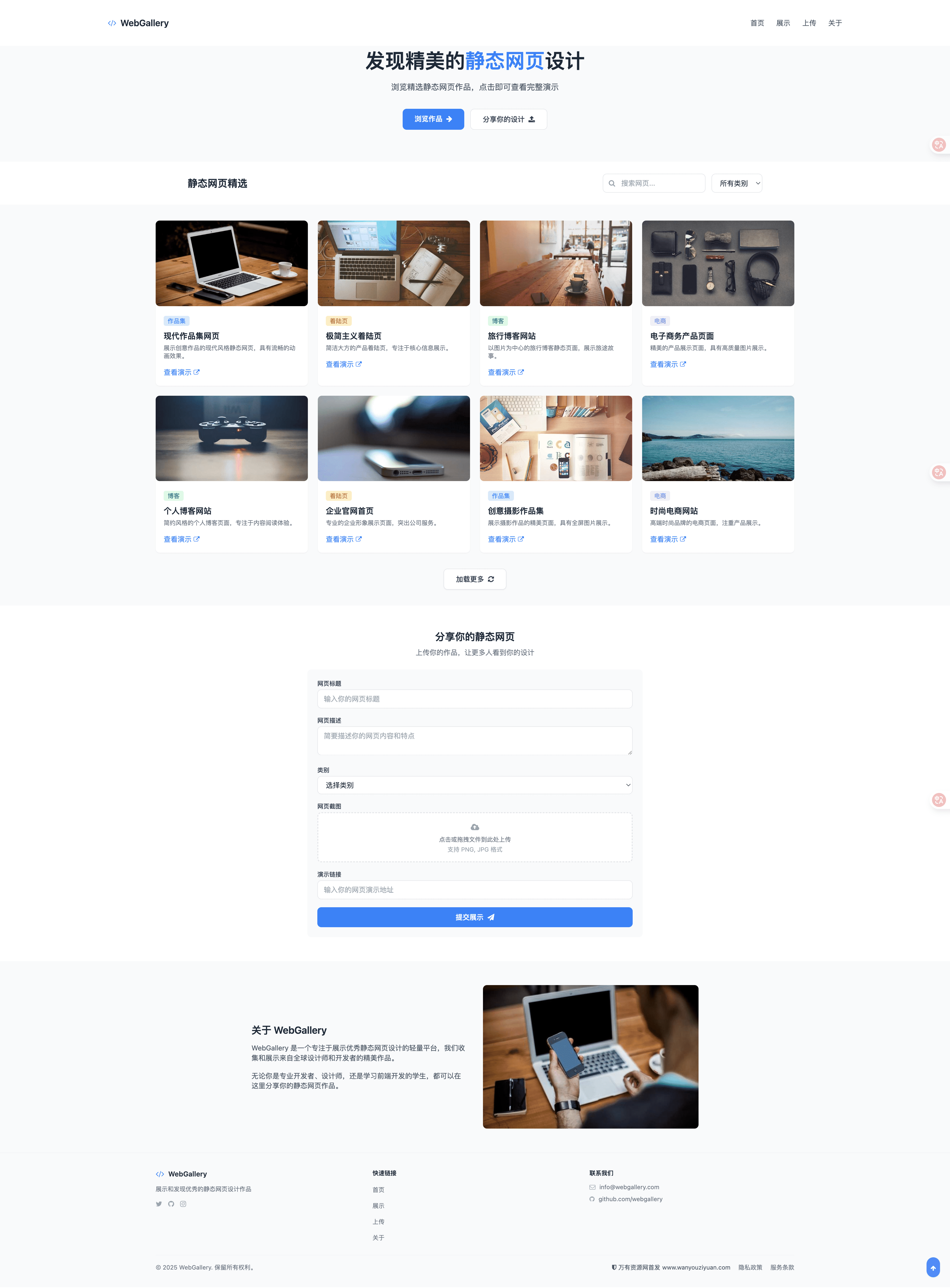 ebGallery 作品设计展示平台静态源码,是设计师与开发者的作品展示利器!采用现代简约风格与蓝色主色调,响应式布局适配全设备,支持以卡片形式展示网页作品,含分类筛选、关键词搜索、加载更多功能,还可上传分享个人静态网页作品